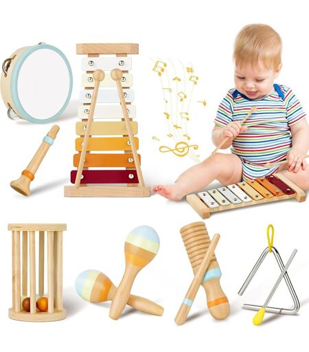 7 en 1 Instruments de Musique Enfant: Jouets musicaux en bois Montessori comprend un xylophone, un tambourin, un triangle avec une baguette, un tube sonneur en bois, des maracas, un bâton de pluie et une trompette. Il est attrayant pour les enfants et constitue un excellent ensemble batteries et percussions musical pour les débutants, permettant aux enfants d'explorer différents sons et styles, tout en favorisant leur créativité. -Le début d'un voyage musical Un magnifique ensemble d'Instrument de Musique Bebe attend d'être découvert et joué par les enfants. Cet ensemble d'Instrument De Musique Enfant comprend : un tambourin, une octave et deux baguettes d'octave, un soufflet double et deux baguettes de soufflet double, un triangle et une baguette de triangle, un tonneau de pluie, une flûte et deux marteaux de sable. Tout ce dont un petit musicien a besoin pour créer un groupe de musique à domicile est inclus ici. Commencez dès maintenant et familiarisez votre petit musicien avec différentes hauteurs, volumes et rythmes. Expérience Multi-Instrumentale pour Tout-Petits - L'ensemble instruments de musique pour enfants Montessori 7 en 1 offre une expérience sensorielle riche. Les différentes tonalités, volumes et rythmes attirent l'attention de votre bébé, développent son cerveau et favorisent un développement harmonieux.Jeux d'Équipe Multijoueurs: Cet ensemble de jouets musicaux colorés est idéal pour le jeu en groupe, comme les fêtes, les réunions de famille, les interactions sociales, etc. Les enfants peuvent s'exprimer à travers la musique, favorisant la communication et l'interaction avec leurs parents; ils peuvent également inviter de bons amis à jouer ensemble et à coopérer pour créer de la musique, organisant ainsi un concert amusant. Jouet d'Éducation Musicale Précoce: Batterie musique instrument c'est un excellent jouet éducatif pour stimuler les sens auditifs de votre enfant et aider à cultiver sa sensibilité musicale. Entraînez les compétences motrices fines en frappant, en secouant et en soufflant, offrant aux enfants une expérience de jeu différente et améliorant la coordination main-?il, le rythme et en renforçant leur concentration. Matériaux Sûrs et Durables: Fabriqué à partir de bois naturel non toxique avec des peintures à base d'eau non toxiques, avec des bords lisses et arrondis, sans bords tranchants, confortable au toucher et adapté à la taille des enfants. Tous les jouets d'instruments de musique présentent des couleurs neutres, leur donnant un aspect plus soigné et confortable. Excellente Idée pour Filles Garçons Bébé: Ces instruments de percussion en bois pour bébés sont des jouets éducatifs merveilleux pour les enfants, très adaptés pour les anniversaires, comme récompense, cadeaux de fête, célébrations, festivals, Noël, Pâques. Livré dans un emballage exquis, c'est un cadeau idéal pour les anniversaires et Noël pour les garçons et les filles âgés de 1 à 5 ans. ...