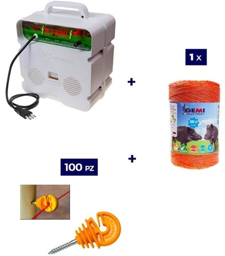 GEMI ELETTRONICA Kit Complet pour Clôture Électrique : 1 x Electrificateur 220V + 1 x Fil 500 mt 6 Mm² + 100 pcs Isolateur pour Piquets en Bois - Clôture Électrifiée