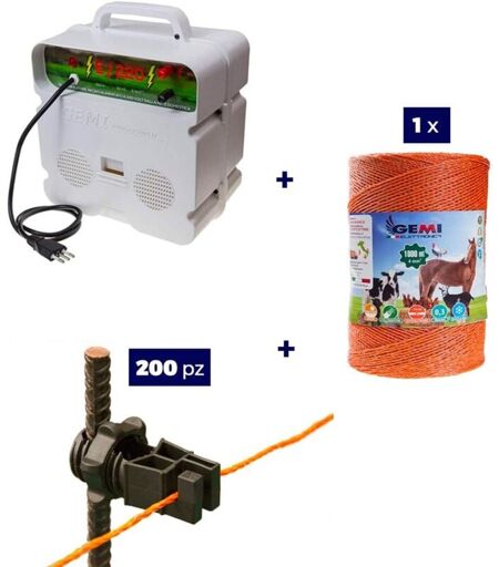GEMI ELETTRONICA Kit complet pour clôture électrique : 1 x ELECTRIFICATEUR 220V + 1 x Fil 1000 MT 4 Mm² + 200 pcs Isolateur Pour Piquets En Fer - clôture électrifiée