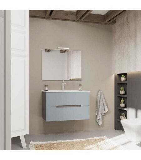 Kiamami Valentina - Meuble De Salle De Bain Suspendu 80Cm 2 Tiroirs Couleur Bleu Mat Et Chêne Magnolia