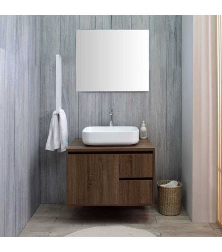 Description générale Le meuble de salle de bain suspendu sous-lavabo de 75 cm en noyer foncé combine élégance et fonctionnalité. Ce meuble comprend un lavabo en céramique fine blanche à poser, ainsi qu'un miroir aux bords polis. Il est conçu pour optimiser l'espace avec une armoire spacieuse, un dossier ouvert pour le siphon d'évacuation et deux tiroirs avec fermeture soft-close. Spécifications techniques Dimensions du meuble : largeur 75 cm, hauteur 50 cm, profondeur 55 cm Dimensions du miroir : 80x70 cm Produit déjà assemblé Compatibilité et accessoires Le lavabo ne possède pas de trou pour le robinet et le trop-plein, ce qui le rend compatible avec des robinetteries à poser ou murales. Notez que le siphon, la robinetterie et la lampe pour le miroir ne sont pas inclus et doivent être achetés séparément. Installation Ce meuble est conçu pour une installation facile grâce à sa structure suspendue. Assurez-vous de suivre les instructions de montage fournies pour une fixation sécurisée. ...