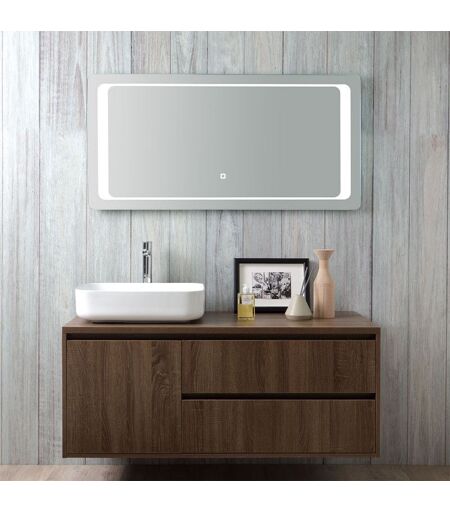 MEUBLE DE SALLE DE BAIN EN BOIS NOYER FONCÉ AVEC LAVABO D'APPUI ET MIROIR À LED AVEC ALLUMAGE TACTILE Si vous recherchez un meuble de salle de bains avec l'effet traditionnel du bois foncé avec un vaste lavabo et un miroir à LED avec allumage tactile capables de refléter au mieux la salle de bains, la collection Siena est la réponse à votre recherche. La composition que nous vous décrivons sur cette fiche est constituée d'un meuble suspendu en bois ennobli avec top en bois couleur noyer, armoire sous-lavabo avec une porte et un dossier ouvert pour faciliter le branchement à la plomberie. En outre, il dispose de deux tiroirs qui peuvent être utilisés en toute leur capacité. Le lavabo à poser est en céramique blanche et a une forme rectangulaire, il est d'ailleurs compatible avec le robinet mural ainsi qu'à poser. Le lavabo se pose sur l'armoire avec une porte. Le miroir, de forme rectangulaire avec angles arrondis, est installé sur un cadre en aluminium et est prévu d'un éclairage périphérique à LED. base: largeur 120cm, hauteur 50cm, profondeur 55cm miroir: largeur 120cm, hauteur 60cm allumage avec capteur tactile Kiamami Valentina propose à ses clients seulement des meubles capables de satisfaire les exigences pratiques et typiques de la salle de bains. Cette composition Siena se caractérise pour fournir une ample tablette à poser et pour la capacité de contenir tous les effets personnels, de manière à faciliter le rangement de la salle de bains. Découvrez toutes les combinaisons de meuble de salle de bain suspendus. Le siphon et la robinetterie ne sont pas compris dans l'offre mais sont en vente séparément.MEUBLE DE SALLE DE BAIN SUSPENDU EN BOIS FONCÉ AVEC LAVABO D'APPUI ET MIROIR TACTILE AVEC LUMIERE PÉRIPHÉRIQUE À LED Un meuble de salle de bains vaste et pratique, sans renoncer à des éléments modernes comme le lavabo et le miroir. La série Siena est disponible en différentes mesures et c'est la réponse pour ceux qui recherchent un aménagement de salle de bains élégant et avec une ample capacité de contenance. BASE Meuble de salle de bains suspendu Collection: Siena Dimensions: largeur 120cm, hauteur 50cm, profondeur 55cm Matériaux: bois ennobli avec bordure en ABS Finition: Bois en noyer foncé avec veinures effet bois Structure: porte et deux tiroirs avec fermeture soft-close Porte sous-lavabo avec dossier ouvert pour permettre le branchement de l'évacuation Tiroirs avec côtés latéraux en bois Côté à jour Plan supérieur en bois Livré déjà assemblé LAVABO Lavabo à poser Céramique blanche Forme rectangulaire avec angles arrondis Grande vasque Installation lavabo côté porte Compatible avec robinetterie murale ainsi qu'à poser SANS trou pour le robinet SANS trou trop-plein Le siphon et la robinetterie NON INCLUS MIROIR Miroir à LED Dimensions: 120X60 Capteur tactile Lumière périphérique Cadre postérieur en aluminium ...