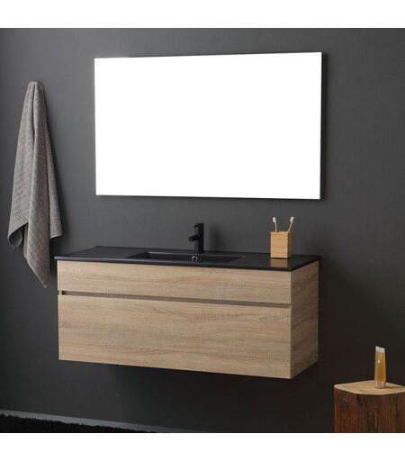 Meuble De Salle De Bain Cm120 En Chêne Aspect Bois Avec Lavabo Noir Mat Et Miroir Sole