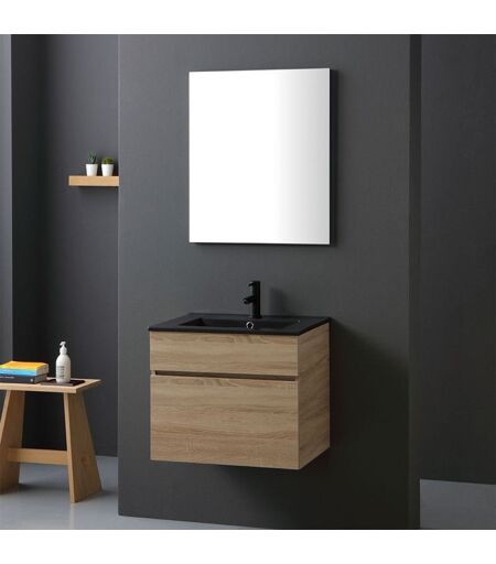Meuble Suspendu Chêne Well Pour Salle De Bain 60cm Avec Lavabo Noir Mat Sole