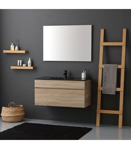 Meuble De Salle De Bain Suspendu 100cm En Chêne Well Avec Lavabo En Noir Mat Sole