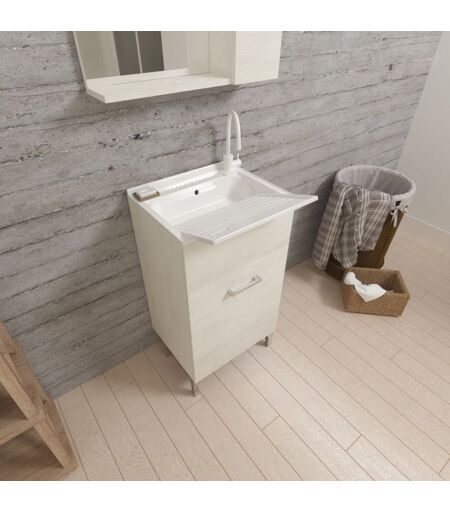 MEUBLE LAVOIR DE RANGEMENT 45X50CM AVEC PLANCHE À LAVER AMOVIBLE KvStore rénove sa Collection dédiée au coin de la buanderie avec un meuble lavoir 45x50cm, planche à laver et finition en chêne blanc. Les meubles sont disponibles en 3 différentes mesures pour permettre à chacun de compléter le propre coin de la buanderie. Ce modèle se caractérise pour sa structure avec une porte en bois plaqué et bordure en ABS. Les pieds réglables et les poignées ont une fine couche chromée. La vasque en polypropylène, profonde 26,5 cm est complète de siphon, tandis que la robinetterie peut être achetée à part. Le lavoir est sans trou pour le robinet, pour laisser la liberté de l'installer à droite, à gauche ou bien d'utiliser un ensemble mural. largeur 45cm, profondeur 50cm, hauteur 83cm finition en chêne blanc planche à laver en ABS blanc, amovible Les meubles-lavoir en plaqué bois, acquierent une élégance rénovée, pour ceux qui ne veulent pas cacher leur buanderie, mais qui veulent l'intégrer dans la salle de bain de réserve et obtenir un aménagement pas seulement fonctionnel mais aussi agréable pour les yeux.MEUBLE LAVOIR AVEC UNE PORTE 45X50 EN CHÊNE BLANC AVEC PLANCHE À LAVER Le lavoir, un élément parfaitement fonctionnel et souvent relégé dans la pièce destinée à la buanderie, devient complément d'aménagement qui s'intègre bien dans n'importe quelle salle de bain, grâce à la nouvelle finition effet bois. Meuble lavoir Collection: Pratico Dimensions: largeur 45cm, profondeur 45cm, hauteur 83cm Structure et finition: meuble en bois plaqué avec bordure en ABS, finition en plaqué chêne blanc 1 porte Poignée et pieds réglables et chromés Hauteur pieds 10cm Vasque en polypropylène, complète de siphon Profondeur vasque 26,5cm Plan à laver amovible en ABS Trou pour le trop-plein SANS trou pour la robinetterie Robinetterie disponible à part Produit en Europe ...