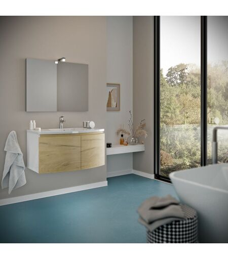 MEUBLE LAVABO DE SALLE DE BAIN ARRONDI 80CM BLANC BRILLANT AVEC PANNEAU FRONTAL EN CHÊNE MIEL Garda est la nouvelle collection de meubles de salle de bain suspendus qui se caractérise pour avoir le frontal arrondi. Le meuble lavabo de salle de bain que nous vous présentons, possède le frontal arrondi avec des portes dans la finition chêne miel. La base se caractérise pour avoir des panneaux latéraux et le frontal à contraste. Le côtés sont en bois ennobli laqués en blanc brillant, tandis que les portes sont en MDF revêtues en PVC chêne miel. Les portes ont la poignée façonnée pour une ouverture aisée et la fermeture ralentie pour éviter les coups. Le lavabo en céramique a une vasque centrale et un large bord latéral qui fournit une surface à poser. Le miroir avec bords polis a une épaisseur de seulement 2cm. base: largeur 80cm, profondeur 36cm sur les côtés et 48cm au centre lavabo: largeur 81cm, profondeur 38,5cm sur les côtés et 49cm au centre siphon, robinetterie et lampe PAS inclus KvStore, aménagement et accessoires pour la salle de bain, sélectionne pour ses clients seulement des produits de qualité et soignés dans les moindres détails. La collection Garda propose ce meuble de 80 cm en trois différentes versions, structure et frontal en blanc brillant, structure en blanc brillant et frontal en chêne miel et enfin, structure en blanc brillant et frontal en chêne polaire. Lignes simples et modernes pour compléter la salle de bain de manière fonctionnelle. Dans l'offre ne sont pas compris le lavabo et le siphon pour le lavabo ainsi que la lampe pour le miroir, chacun de ces éléments peuvent être achetés séparément.MEUBLE POUR LAVABO DE SALLE DE BAIN SUSPENDU ARRONDI 80CM AVEC STRUCTURE EN BLANC BRILLANT ET PORTES EN CHÊNE MIEL Meuble de salle de bain suspendu Garda avec frontal arrondi et portes en chêne miel. Un design simple et moderne pour un meuble spacieux et parfait pour compléter l'aménagement de salle de bain. BASE: Meuble de salle de bain arrondi Collection: Garda Dimension: largeur 80cm, hauteur 40cm, profondeur 36-48cm Structure et coque: côtés en bois ennobli laqués; portes arrondies en MDF revêtu en PVC très résistant à l'humidité. Côtés en blanc brillant Portes en chêne miel Portes avec fermeture amortie Poignée façonnée Dossier vide pour faciliter le branchement des évacuations LAVABO: Lavabo en céramique Blanc Largeur 81cm, profondeur 38,5-49cm Trou pour le trop-plein Trou pour la robinetterie Robinetterie et siphon NON inclus MIROIR: Miroir avec bords polis 80X80 Cadre en bois ennobli revêtu en ABS gris Épaisseur 2cm Lampe NON incluse, disponible séparément Plaques, vis et chevilles non incluses. ...