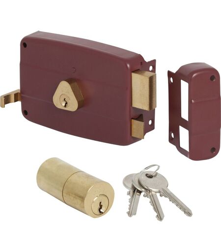Serrure A appliquer pour le bois. Pêne dormant et pêne demi-tour, bouton interne et cylindre externe fixe. Main gauche ...