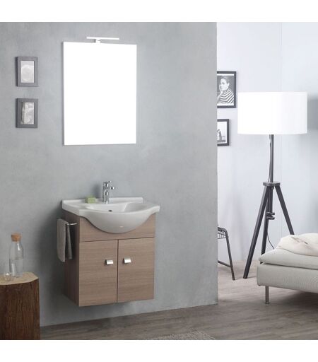 MEUBLE CONTENANT LAVABO AVEC MIROIR ET LUMIÈRE EN BOIS Kiamami Valentina mobilier de salle de bains à l'époque de la conception de cette série series pour petits espaces, a décidé de lancer les meubles en finition chêne fumé, neutre et élégant, adapté pour ceux qui aiment le style simple mais moderne et actuel. La base de l'armoire est suspendue et se compose de matériaux sélectionnés et sélectionnés pour assurer sa durabilité, en fait : la base est en bois le lave-mains est en céramique lampe LED les pommeaux et la poignée latérale en ABS chromé. Inclus dans composition du meuble de salle de bains base murale suspendue avec deux portes en chêne fumé de 58 cm, lavabo en céramique de haute qualité, miroir de 52 cm complet avec lampe LED mais sans prise et interrupteur. Boutons et barre pour serviettes latérales inclus. Le siphon et les robinets ne sont pas comptés comme inclus, avec la possibilité d'acheter séparément.SÉRIE FACILE À PARTIR DE 58 CM - COMPOSITION EN CHÊNE FUMÉ COMPLETE Cette composition comprend la base de l'armoire à deux portes, le lavabo respectif en céramique et le Miroir à lumière LED. Conçu pourmeubles de salle de bains des petits espaces est une ligne moderne et fine qui s'adapte à n'importe quelle salle de bains. Le robinet et le siphon de vidange ne sont pas inclus. MATÉRIAUX STRUCTURAUX ET ENCADREMENT BASE: Panneau en chêne laminé avec bordure en ABS ; Miroir: Bordures en stratifié, sans prise et interrupteur LAVABO: En céramique de première qualité LAMPE: ampoule incluse 4.5W, 6000K énergie Clasa A+ avec abat-jour IP44, CL II et longueur de câble 50 cm POMMEAU et POIGNÉES : ABS Chromé DIMENSIONS Base: L cm 58 P cm 30 H cm 62 Lavabo: L cm 58 P cm 30/47,5 H cm 3 Miroir: L cm 52 Sp cm 2 H cm 68 Afin de satisfaire tous les besoins et toutes les préférences, Kvstore vous offre les mêmes meubles également en chêne blanc et chêne foncé à des prix avantageux et uniques. ...