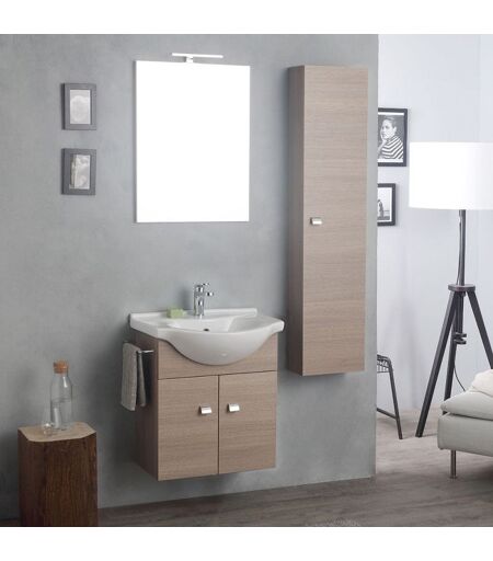 MEUBLES AVEC LAVE-MAINS COMPLET DE MIROIR AVEC LUMIERE + COLONNE CHÊNE FUMÉ ; La version de la série composition complete Facile qui est proposée sur cette page est celle en finition chêne fumé, une couleur neutre, à mi-chemin des autres propositions de la série Facile en finition claire et finition foncée. L'offre comprend tous les éléments nécessaires pour un meuble complet furnishing même s'il convient pour petits espacesfort>, à savoir : le meuble bas en chêne fumé élégant à deux portes, le lavabo en céramique haute qualité, un miroir complet avec lampe LED mais sans prise et interrupteur et enfin une colonne murale toujours en bois fumé. Les dimensions des meubles : Base : 57 cm Colonne : 30,5 Miroir : 52 cm Les portes ont des boutons en ABS chromé et le porte-serviettes sur le côté de la base est réalisé dans le même matériau. La composition est livrée complète avec kit de fixation mais le robinet et le siphon ne sont pas inclus, avec possibilité d'achat séparé ;COMPOSITION PETITS ESPACES CHÊNE FUMÉ COMPLET La série Facile offre une solution complète d'ameublement de salle de bains pour les petites salles de bains qui exigent une utilisation maximale de l'espace. La finition en chêne fumé rend votre salle de bains harmonieuse et moderne.>. La COMPOSITION DU MEUBLE DE LA SALLE DE BAIN INCLUT: lla base, le lavabo, le miroir avec lampe et la colonne NON INCLUS: le robinet et le siphon peuvent être achetés séparément MATÉRIAUX STRUCTURE ET STRUCTURE BASE ET COLONNE: Panneau stratifié chêne avec bordure en ABS MIROIR : Bordé en stratifié, sans prise et interrupteur LAVABO: En céramique de première qualité LAMPE : Éclairage a led POMMEAU ET POIGNÉE: ABS Chromé DIMENSIONS Base: L cm 58 P cm 30 H cm 62 Lavabo: L cm 58 P cm 30/47,5 H cm 3 Miroir: L cm 52 Sp cm 2 H cm 68 Colonne: L cm 31,5 P cm 16 H cm.136 Disponibilité de la même ligne de meubles également en chêne blanc et chêne foncé. ...