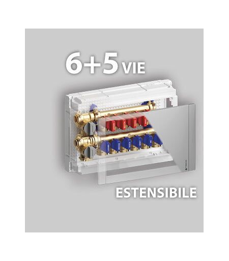 Sorties d'eau froide : 6 Points d'eau chaude : 5 Le collecteur peut être adapté à divers besoins jusqu'à un maximum de 7+6 sorties, grâce à l'ajout de la vanne en T Fastec (code 1911602 + Niples 1912602) Comprend : - Paire de collecteurs DN10 avec interceptions simples ; - Boîte 310 x 210 x 85 mm ; - Supports de fixation ; - Protection des chantiers de construction ; - Étiquettes adhésives pour l'identification de l'utilisateur. N'inclut pas : - Couvercle de porte E03 (Code 05732) ...
