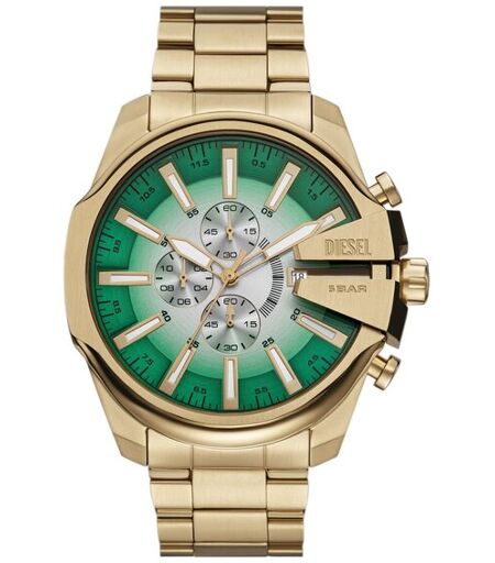 GARANTIELa montre Diesel Mega Chief Slim de 48 mm présente un cadran or, vert et argent brossé poli effet rayon de soleil, mouvement chronographe et bracelet en acier inoxydable doré. Taille du boîtier: 54x61; Épaisseur du boîtier: 8.5MM; Étanchéité: 3 ATM; Matériau du boîtier: Acier inoxydable; Finition du boîtier: Combo; Matériau du bracelet: Acier inoxydable; Couleur du bracelet: Doré; Fermeture: Boucle à double pression; Couleur du cadran: Noir, Or, Blanc; Mouvement: Quartz/3 Hand ...