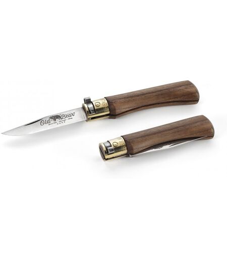 Un couteau Old Bear durable dans votre sac Lame acier inox AISI 420 de 7cm - Logo intégré Solidité : -+54/56 HRC - Finition lame satinée Affûtage à la pierre réalisé manuellement par un artisan Manche en bois de noyer sombre Couteau fermé : 10cm - Poids : 32g Fabrication artisanale en Italie ...
