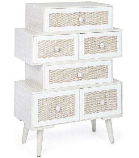 Commode 6 tiroirs Montiel bois blanc style rustique Commode en MDF. Façade de tiroir recouverte de tissu (coton/lin). Fini avec de la peinture à base d'eau. Boutons en métal. Pieds à assembler. Les mesures: Longueur 60cm; Largeur 30cm; Hauteur 83cm. ...