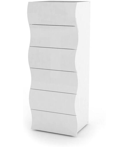 Description générale Commode moderne au design ondulé, parfaite pour la chambre à coucher, avec six tiroirs spacieux et une structure en hauteur. Sa finition blanche brillante apporte une touche contemporaine à tout type d'environnement. Spécifications techniques Fabriquée en stratifié résistant aux chocs et aux rayures Facilité de nettoyage Dimensions : 50 cm (largeur) x 40 cm (profondeur) x 122 cm (hauteur) Livrée démontée avec kit et livret d'instructions de montage Emballage résistant adapté au transport Compatibilité et accessoires Aucun accessoire spécifique requis Compatible avec divers styles de décoration intérieure Installation Facile à assembler grâce au livret d'instructions fourni Requiert un espace suffisant pour le montage Utilisation Idéale pour ranger des vêtements de manière discrète et ordonnée Peut servir de support pour des bibelots ou objets décoratifs sur le dessus ...