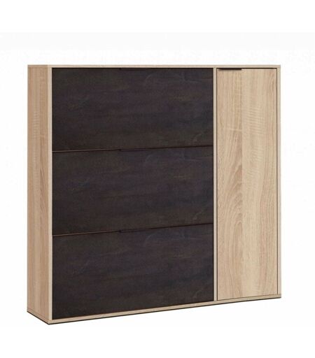 ÉTAGÈRE À CHAUSSURES - Meuble à chaussures avec 4 portes, Meuble bas polyvalent avec 5 ètagères, E'tagère à chaussures moderne, 106x22h115 cm, Chène et Noir. STRUCTURE ET UTILISATION - Meuble à chaussures moderne et peu encombrant avec trois portes abattantes et une porte battante - a l'intèrieur, il est possible de ranger jusqu'à 30 paires de chaussures grâce à la structure à double capacitè pour les portes abattantes et cinq ètagères règlables en hauteur la porte battante - Meuble èlègant et fonctionnel parfait à placer à l'entrèe, couloir, buanderie, salle de bain, placard, garage, chambre, balcon, terrasse ou entrèe. CERTIFICATIONS ET INNOVATIONS - Article d'ameublement design certifiè PEFC, parfait pour meubler un environnement moderne et lumineux: le produit idèal pour ceux qui recherchent un produit fonctionnel et peu encombrant pour leur maison ou leur appartement - Garantie de 2 ans à partir de la date d'achat - Livrè dèmontè avec un livret d'instructions de montage. ...