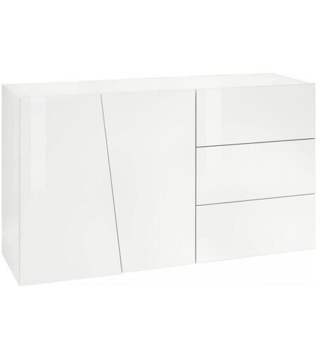 BUFFET MODERNE : Buffet au design géométrique avec deux portes et trois tiroirs sur le côté gauche, utilisable comme meuble TV de salon - Entièrement en blanc brillant. STRUCTURE ET UTILISATION: Buffet de salon pratique et peu encombrant structuré avec deux portes battantes sur le côté gauche et trois grands tiroirs sur le côté gauche, à l'intérieur avec des étagères dans la partie des portes - Les portes et les tiroirs sont sans poignées, tous deux équipés de solides charnières / guides métalliques - La structure est entièrement en blanc brillant - L'étagère du haut est parfaite pour accueillir votre téléviseur ou vos bibelots préférés. PRATIQUE ET INNOVANT : Son design moderne et élégant rend ce buffet à tiroirs parfait pour être placé dans un environnement moderne et lumineux, dans n'importe quelle pièce de votre appartement, du hall à la chambre : c'est le produit idéal pour ceux qui recherchent un article fonctionnel peu encombrant pour votre maison - La couleur blanche ...