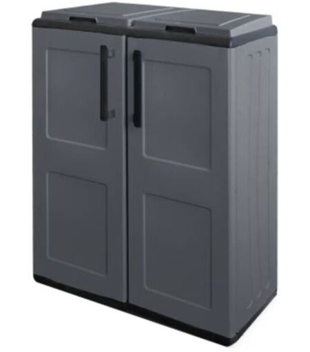 WASTE CABINET - Poubelle à deux portes pour la collecte séparée de deux types, entièrement grise. STRUCTURE ET UTILISATION - Structure peu encombrante parfaite pour contenir les sacs et séparer les déchets de manière ordonnée, solution pratique et durable pour la collecte séparée des déchets - Couvercles équipés de verrous de sécurité qui garantissent la protection contre le vent et l'ouverture accidentelle - L'anneau porte-sac est particulièrement robuste afin d'éviter la casse - Equipé d'une étagère réglable sur le socle - Pratique pour optimiser l'espace, il peut également être placé à l'extérieur dans le jardin, balcon, terrasse, cave et garage. CARACTÉRISTIQUES TECHNIQUES - Produit entièrement fabriqué avec du plastique recyclé, italien, 100% recyclable - Produit éco-durable entièrement construit en polypropylène, matériau antichoc, résistant au froid et aux rayons UV, aux intempéries, aux huiles et aux solvants, n'absorbe pas les odeurs et ne retient pas humidité - L'assemblage ...