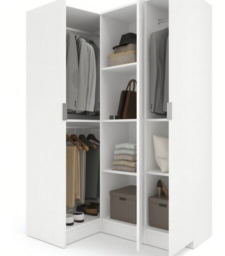 Dmora - Armoire Dhuar, Meuble d'angle pour chambre, Armoire d'angle avec 3 portes battantes, 133x91h184 cm, Blanc