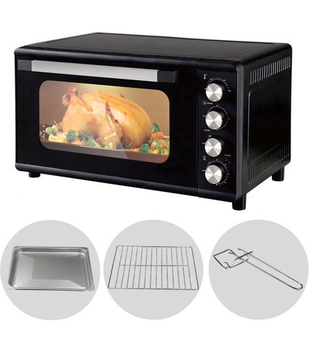 Typologie électrique, Pays de fabrication Chine, Méthode de cuisson Ventilée, Capacité 45L, Thermostat régulation température, Plan cuisson en Inox, Double vitrage, Température minimale 100°C, Température maximale 230°C, Étages de cuisson 3, Minuterie électronique 60 min, Poids 11kg ...
