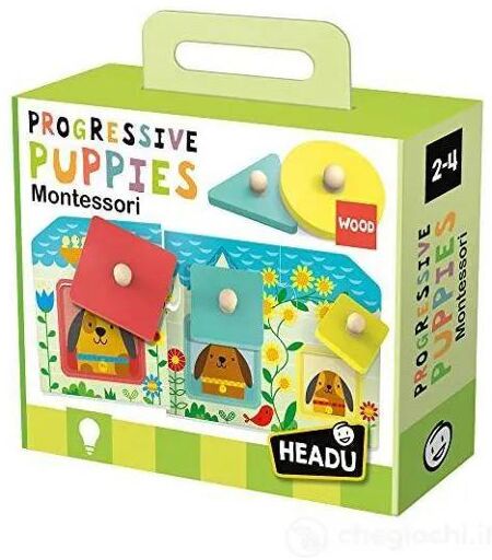 Progressive Puppies Montessori - Headu Da più grande al più piccolo! Il gioco, ispirato al metodo degli incastri piani Montessori, allena la manualità fine dei bambini. Con il materiale in dotazione, i bambini ricompongono le casette e scoprono tanti animali, inoltre, si divertono ad allocare le forme in legno negli spazi corrispondenti. Pensiero logico; Seriazione; Allenare la manualità; Sviluppare la coordinazione occhio-mano 3 puzzle progressivi; 9 forme in legno progressive ...