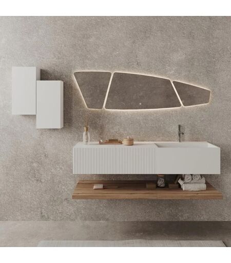 MEUBLE DE SALLE DE BAINS AVEC TIROIRS LATÉRAUX ET LAVABO EN RÉSINE Découvrez notre élégant meuble de salle de bains suspendu 140 cm design, une solution parfaite pour meubler votre salle de bains avec style et fonctionnalité. Ce meuble, fabriqué avec des matériaux de haute qualité, allie praticité et design moderne qui s'adapte à tout type de décoration. Caractérisé par deux grands tiroirs latéraux, il offre un espace de rangement généreux pour tous vos articles de salle de bains. Le lavabo en résine, résistant et facile à nettoyer, s'intègre parfaitement avec la base en finition blanche et bois miel, créant un contraste raffiné et élégant. Dimensions : 140 cm de large, 46 cm de profondeur Couleur/Finition : Blanc et bois miel Points forts du produit : Design moderne et attrayant Haute qualité des matériaux Durabilité dans le temps Ce que l'offre comprend : Base du lavabo Étagères Miroir complet Ce que l'offre ne comprend pas : Siphon Robinet Meubles hauts Vis de fixation Ajoutez une touche d'élégance et de fonctionnalité à votre salle de bains avec ce meuble de salle de bains suspendu 140 cm de Kiamami Valentina. Idéal pour ceux qui recherchent un meuble de salle de bains de haute qualité avec un design contemporain. ...