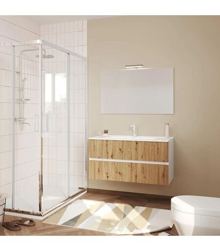 Meuble Salle De Bain 100cm Blanc Façade Chêne Cannelé, Miroir 100x60 Salina