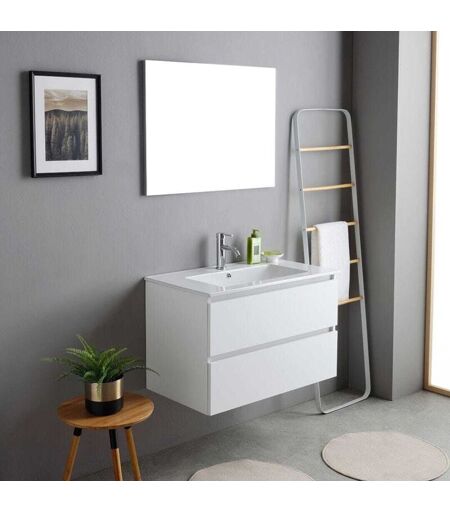 KIAMAMI VALENTINA Meuble Salle De Bain Suspendu 80Cm Blanc Avec Lavabo Et Miroir Bilbao