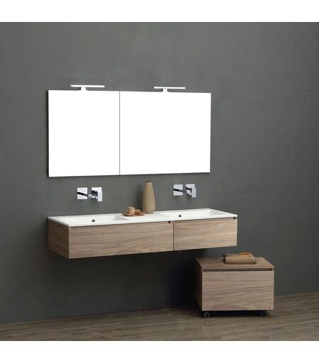 MEUBLE DE SALLE DE BAINS SUSPENDU 150CM CHÊNE NATUREL DOUBLE VASQUE Valentina est la nouvelle collection de meubles de salle de bains personnalisables, conçue pour répondre aux besoins de chaque client. Avec Valentina, il est possible de créer votre espace de salle de bains sur mesure en combinant les différents éléments de la collection, afin de réaliser le meuble de salle de bains sur mesure. Dans cette fiche, nous vous proposons une composition d'une largeur de 150cm. Cette composition présente une double vasque qui se distingue par l'absence de trou pour le robinet et qui est adaptée pour être associée à un robinet mural. La base est composée de 2 tiroirs équipés de la technologie soft close. double vasque de 150cm en marbre reconstitué base avec tiroir de 60 cm base avec tiroir de 90 cm base avec tiroir + kit de roues pour appui au sol miroir au ras du mur de 60x70 cm miroir au ras du mur de 90x70 cm 2 lampes LED chromées Le robinet et le siphon ne sont pas inclus dans l'offre. Les tiroirs sont livrés déjà assemblés, de plus, pour optimiser l'espace du tiroir supérieur, il est recommandé d'utiliser une bonde gain de place. Ce meuble de salle de bains est conçu pour tous les espaces nécessitant un ameublement simple mais fonctionnel, qui s'adapte parfaitement aux besoins de l'utilisateur grâce à la double vasque et aux deux tiroirs de rangement. ...