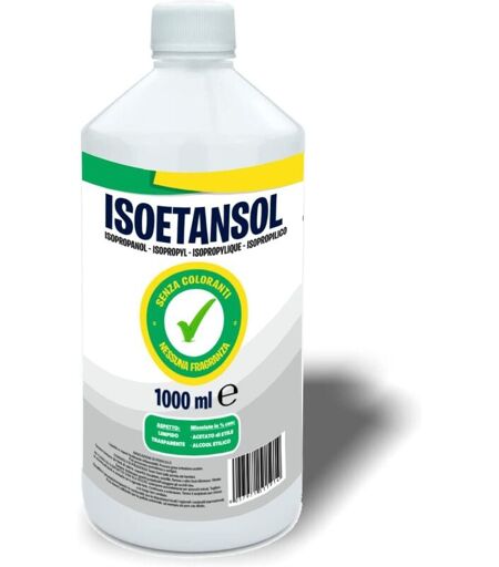 ISOETANSOL 100AE 1000ml d'alcool isopropanol purete' 99,9% pour la de'sinfection et le nettoyage. Sans colorants ni parfums. Utile pour nettoyer les e'crans de PC, d'ordinateurs portables et de smartphones. L'isopropanol est normalement utilise' dans de nombreuses applications, allant du nettoyage aux cosme'tiques. L'isopropanol peut etre utilise' en solution comme de'graissant pour de nombreux types de sols et de surfaces. ISOETANSOL est ide'al pour e'liminer les salissures, les re'sidus de colle et comme de'graissant. ...
