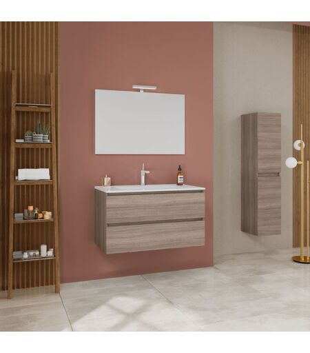 Meuble De Salle De Bains Mural 90cm Chêne Naturel Tiroirs, Lavabo, Miroir Berlin