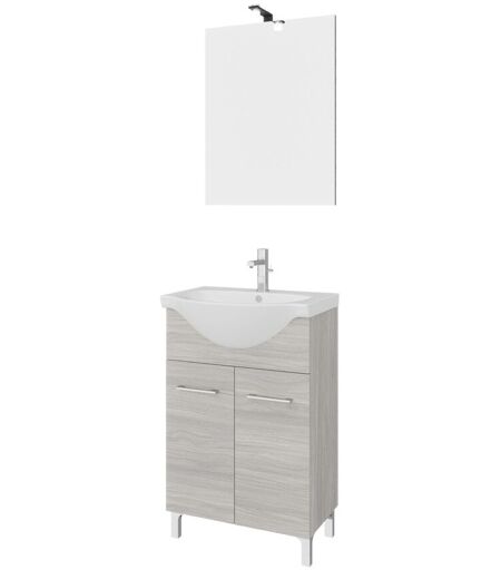 Meuble De Salle De Bains Sur Pied 55cm 2 Portes Chêne Gris, Lavabo Et Miroir Rimini