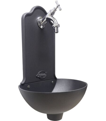 Fontana a muro mod. Malta con rubinetto cod. 303 in ottone cromato Composta da: Vasca e frontale in fusione d’alluminio, con trattamento di cromatazione anticorrosivo, verniciati a polvere epossidica colore antracite Rubinetto in ottone cromato Misure frontale: Larghezza alla base 22,5 cm Altezza 32 cm Altezza foro rubinetto/base del frontale 25,7 cm Misure vasca: Larghezza massima 33 cm Profondità 21 cm Altezza 14,5 cm Foro di scarico 1" 1/4 filettato Misure rubinetto: Sporgenza 10 cm ...