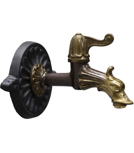 Robinet artistique en laiton bruni avec goujon et rosace en fonte d'aluminium peint en gris fonte. Le robinet est équipé d'un support en caoutchouc et d'un régulateur de débit. Mesures de la rosace : Hauteur 12,5 cm Largeur 17cm Épaisseur 1,5 cm Mesures du robinet : saillie de 16 cm ...