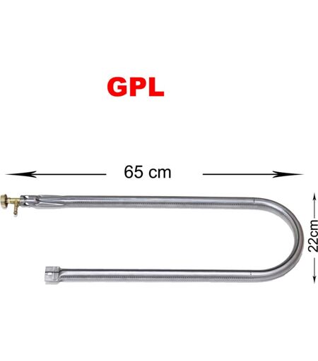 Brûleur à gaz pour barbecue avec robinet au choix, idéal pour les barbecues avec grille en fonte et pierres de savon/lave. Brûleurs en forme de U disponibles en trois tailles : longueur 48 cm - largeur 12 cm longueur 55 cm - largeur 22 cm longueur 65 cm - largeur 22 cm Brûleurs droits disponibles en deux tailles : longueur 50 cm longueur 100 cm Distance entre le robinet et le début du trou environ 12 cm Longueur de la flamme du brûleur incurvé : 29 cm - 32,5 cm - 42 cm Longueur de la flamme du brûleur droit : 31,5 cm - 81 cm Pas de filetage pour taraud M10x1 Robinets en laiton pour GPL ou Méthane disponibles pour tous les brûleurs ...