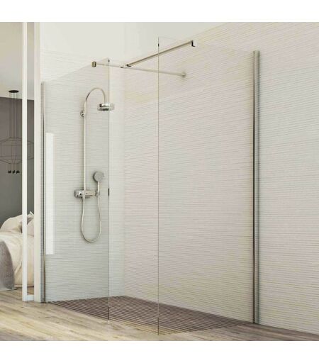 Corner est la gamme de cabines douche en verre ouvertes faites dans plusieurs dimensions avec nombreux possibilité de combinaison. Le paroi Walk in naissent à la fin de transmettre une idée de confort et d'élégance, ils donnent à la salle de bain plus de luminosité sans apparaître encombrant. Ils sont particulièrement indiquées pour milieux avec des mosaïques ou revêtement avec des pierres de qualité, ils sont indiquées aussi pour valoriser les colonnes douche de design ou robinets en acier inox. Caractéristiques: Cabine douche Walk In idéal pour un receveur de 70x110 CM Cabine douche composé par un verre de 70 CM et un verre de 70 CM Hauteur produit: 198 CM Ouverture entrée: 40 CM Verre de sécurité épaisseur 8mm transparent Barre angulaire : section 2,5x1 cm, longueur 100 cm en acier, on peut le réduire jusqu'à 10CM de longueur avec un simple coupe. Il est conseillé de laisser 40-50 cm d'espace d'entrée pour un correct montage Profils en aluminium anodisé chromé 4x2,3 cm Bouchons en ...