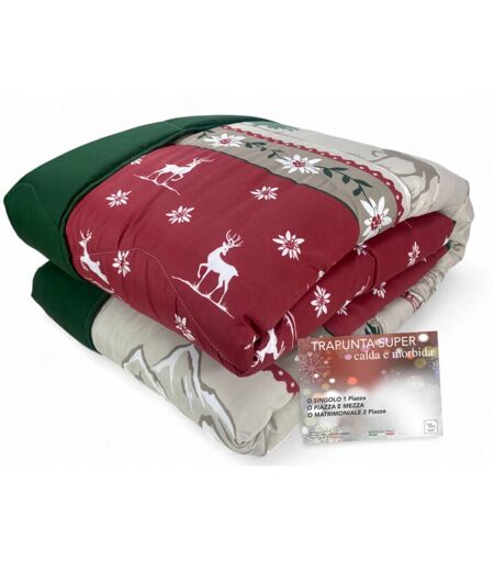 Courtepointe d'hiver Super Fantasy Hut - Style tyrolien Made in Italy La couette d'hiver avec motif Baita Super est conçue pour ceux qui aiment le style chaleureux et accueillant des maisons de montagne. Les couleurs intenses rouge, vert et beige, combinées à des motifs de cerfs, de pins et d'edelweiss, créent une atmosphère tyrolienne authentique. ️ Pourquoi le choisir ? Avec un rembourrage de 300gr/m² en polyester hypoallergénique et un tissu extérieur en microfibre douce, il garantit confort et chaleur tout au long de la saison froide. Entièrement produit en Italie, il allie qualité et style alpin. ❄️ Caractéristiques principales : Motif cabane d'hiver : cerfs, pins, chalets et fleurs sur fond rouge et beige. Rembourrage chaud 300gr/m² : idéal pour les climats froids. Microfibre hypoallergénique : douce, respirante et lavable. Made in Italy : qualité artisanale et souci du détail. Entretien facile : Lavable en machine, ne se compacte pas. Tailles disponibles : Lit simple : 170x260 ...