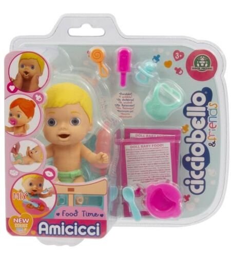 Amuse-toi avec tes Cicciobello Amicicci! Prépare ta nourriture... et donne-lui a manger avec la cuillere! Fais attention, il peut s'en mettre partout! Donne-lui a boire Contient : 1 Ciccio Amicicci Garçon, 1 couche amovible,2 sachets de nourriture, Assiet ...