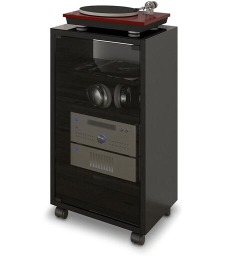 Meuble HI-FI et meuble TV avec porte réversible, 3 étagères et 4 roulettes pivotantes. La Porte Active, à ouverture push-pull en verre trempé Europe Gris (fumé), permet l'entrée de télécommande des appareils placés à l'intérieur. Capacité maximale 50 kg Porte réversible en verre trempé fumé Ouverture de porte Push-Pull Nr. 3 étagèresNr. 4 roues pivotantes ...