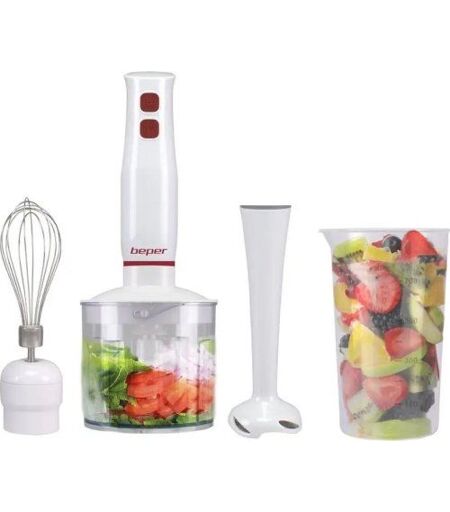 Beper P102FRU200 4-in-1 hand blender set 4-in-1 blender ideal for mixing, blending and shredding. Various accessories included: immersion shaft with 2 stainless steel blades, stainless steel whisks, chopper with 500 ml graduated container and stainless steel blades, 700 ml graduated container. Two selectable speeds to better blend food. Ergonomic handle for easy grip. PRODUCT SIZE: 36X6,5X6,5 CM MATERIAL: STAINLESS STEEL/ABS POWER: 400 W GROSS WEIGHT: 3,90 KG PACKAGING SIZE: 49,9X23,2X25,5 CM ...