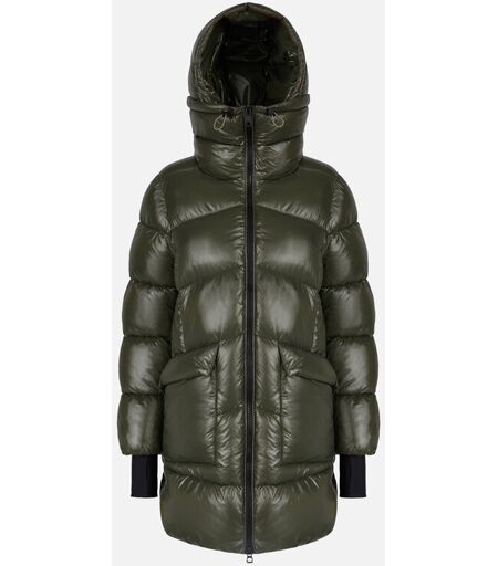 Parka longue pour femme au style moderne et aux lignes citadines, qui offre des propriétés imperméables et coupe-vent tout en garantissant respiration et confort. Parka longue pour femme au style moderne et aux lignes citadines, qui offre des propriétés imperméables et coupe-vent tout en garantissant respiration et confort. Dans cette variante vert olive, ce modèle est réalisé en nylon laqué avec une doublure et un rembourrage recyclés et doté de poignets intérieurs resserrés qui augmentent la protection. Serilda est le manteau idéal pour affronter avec assurance les journées en ville, conjuguant fonctionnalité et design contemporain. ...