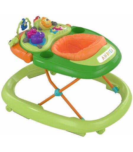 Le trotteur Walky Talky est muni de 4 roues (dont deux pivotantes à l’avant pour aider le guidage) et d’une structure réglable sur 3 hauteurs pour suivre la croissance de l’enfant et que ses pieds reposent bien sur le sol. Le dossier est haut pour bien soutenir le dos de l’enfant et rembourré pour un maximum de confort. Il est doté d’un tableau d’éveil électronique en 3D sur le thème de la jungle avec de joyeuses mélodies et jeux de lumières. Le plateau de jeu dispose d’une barre de jeu en 3D. L’enfant peut s’amuser avec la barre de jeu en position haute pour profiter au maximum de toutes les activités. Le plateau de jeu est également amovible, pratique pour jouer à même le sol dans la maison. Il est équipé de 6 freins appelés « stoppeurs » qui empêchent la structure de basculer dans les escaliers et d’un double système de fermeture évitant que la structure se replie accidentellement. Une fois plié le trotteur est très compact pour pouvoir être rangé facilement. ...