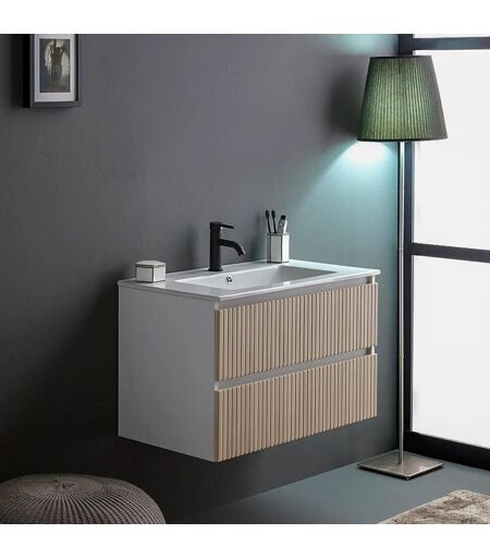 Meuble De Salle De Bains Suspendu 100cm 2 Tiroirs Blanc Et Chêne Cannelé Bilbao