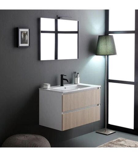 Meuble De Salle De Bains Cannelé 80cm Blanc Et Chêne Doré Avec Miroir 80x60 Bilbao