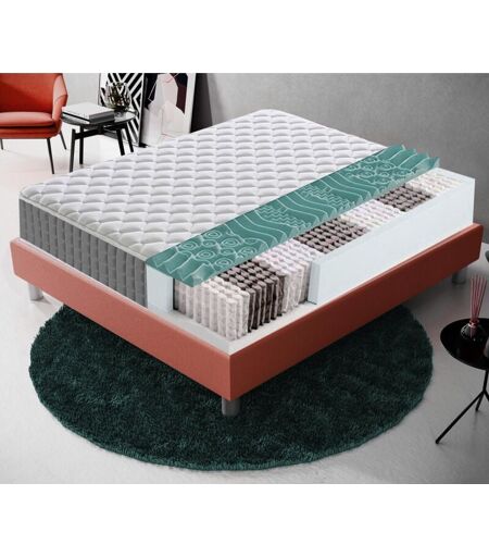 Matelas à Ressorts ensachés et mousse mémoire - Epaisseur 22 cm La hauteur du matelas est de 22 cm. Il est doté d'une couche de mousse à mémoire de forme de 2 cm Les ressorts ont une hauteur de 14 cm et sont fabriqués en fil d'acier au carbone phosphaté. Ce matelas a 700 ressorts dans la taille 140x190. Peu importe la position dans laquelle vous dormez, sa structure interne et ses matériaux innovants améliorent la respirabilité du produit, en empêchant la sensation de chaleur et l'accumulation d'humidité. Le matelas pourra épouser le forme de votre corps. Il apporte un grand soutien à la zone des épaules et du bassin. Le matelas a une rigidité de 7/10,c'est un produit de soutien, idéal pour le dos. Entièrement fabriqué en Italie Durée de la garantie : 5 ans Il porte le marquage CE et les matériaux sont certifiés. Fiche technique Type de matelas: Molle + Memory Niveau de rigidité: 7/10 Nombre de ressorts (version 160x190): 800 Hauteur du matelas: 22; Hauteur de la mousse à mémoire: 2; ...
