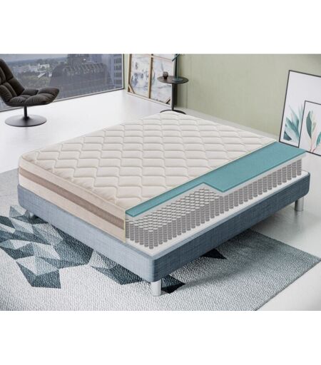 Matelas Ressorts Ensachés - Accueil Mousse HR - Epaisseur 21 Cm Matelas à Ressorts ensachés et Mousse HR Epaisseur 21 est un matelas à ressorts ensachés indépendants La hauteur du matelas est de 21 cm. Il est doté d'une couche de Mousse Les ressorts ont une hauteur de 14 cm et sont fabriqués en fil d'acier au carbone phosphaté. Peu importe la position dans laquelle vous dormez, sa structure interne et ses matériaux innovants améliorent la respirabilité du produit, en empêchant la sensation de chaleur et l'accumulation d'humidité. Le matelas a une rigidité de 8/10,c'est un produit de soutien. Entièrement fabriqué en Italie Durée de la garantie : 5 ans Il porte le marquage CE et les matériaux sont certifiés. Fiche technique Type de matelas: Ressorts Ensachés Niveau de rigidité: 8/10 Nombre de ressorts 700 (version 140x190): Hauteur du matelas: 21 cm; Caractéristiques 100% Anatomique 100% respirant Marquage CE Sans substances nocives 100% fabriqué en Italie L'intérieur de chaque matelas ...