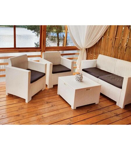 DESCRIPTION GÉNÉRALE Ensemble de salon d'extérieur Venere, idéal pour 4 personnes, composé de 2 fauteuils à dossier haut, 1 canapé 2 places, 4 coussins et 1 petite table. Fabriqué en plastique renforcé effet rotin, cet ensemble est parfait pour les repas ou apéritifs en terrasse, jardin ou au bord de la piscine. SPÉCIFICATIONS TECHNIQUES Matériau : polypropylène renforcé, 100% recyclable Résistant au froid, aux rayons UV, aux intempéries, aux huiles et aux solvants Dimensions : Fauteuil 75x58h79 cm, Canapé 131x58h79 cm, Table basse 64x64h40 cm Montage simple et rapide Lavable et facile à nettoyer INSTALLATION Le produit est livré démonté avec un livret d'instructions de montage facile à interpréter. ...