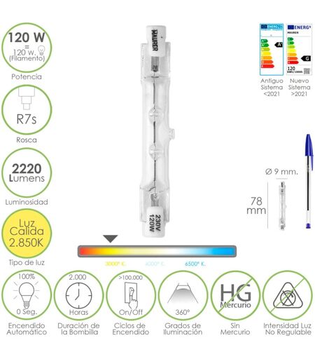 Ampoule Halogène Pour Spots Filetage R7S. 120 watts. 2220 lumens. Lumière chaude (2850º K) Fil : R7S. Puissance : 120 W. 2850 º K. (Kelvin), lumière chaude, lumière jaune. 2220 lumens. Ouverture faisceau/lumière : 360º Allumage instantané. Durée de vie de l'ampoule 2 000 heures. Cycles d'allumage>100 000 Sans mercure. Certification/efficacité énergétique. A+/G (Nouveau Règlement UE) Ne convient pas aux gradateurs. Taille : Ø 9 mm. x 78 mm.(alt) Article connu sous le nom d'ampoules linéaires, d'ampoules à économie d'énergie, d'ampoules d'affichage.Ampoule Linéaire Halogène Pour Spots - Filetage : R7S. Puissance : 120 W. - 2850 º K. (Kelvin), Lumière chaude, lumière jaune. 2220 lumens. Faisceau/ouverture lumineuse : 360º - Allumage instantané. Durée de vie de l'ampoule 2 000 heures. Cycles d'allumage>100 000 - Sans mercure. Certification/efficacité énergétique. A+/G (Nouvelle Réglementation UE) Ne convient pas aux variateurs. - Taille : Ø 9 mm. x 78 mm.(alt) Article connu sous le nom ...