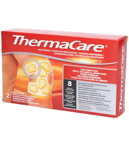 Soulagement ciblé des douleurs au genou associées à : une sollicitation excessive, une foulure et/ou une entorse, de l’arthrite, une tension musculaire Pratique et ergonomique : Les patchs autochauffants ThermaCare® Genou ont été spécifiquement développés pour s’adapter au genou. Les 2 points de fixation adhésifs garantissent une tenue longue durée pour 8h de chaleur constante*. Soulagement prolongé : Les alvéoles des patchs autochauffants ThermaCare® Genou diffusent une chaleur homogène et constante à 40°C pendant 8 heures* pour vous aider à rester actif toute la journée. Sans actif médicamenteux : Les patchs autochauffants ThermaCare® Genou soulagent la douleur naturellement sans actifs médicamenteux. Les multiples alvéoles des patchs contiennent des agents naturels thermoréactifs à l’air (charbon, fer). Au contact de l’oxygène dans l’air, les alvéoles diffusent une chaleur qui cible et apaise la douleur. Conseil d'utilisation Ouvrir le sachet juste avant utilisation. - Ne pas couper le patch. - Séparez les bandes latérales en déchirant délicatement l’encoche perforée. - Placez le côté sombre des alvéoles vers la peau, sur la zone douloureuse et fixez le patch en veillant à ce que l’ouverture circulaire se trouve sur la rotule. - Ajustez la tension des deux bandes de façon que le système auto-agrippant s’attache à la zone de fixation. Se référer à la section Ne pas utiliser pour connaître les zones où le patch ne doit pas être appliqué. - ThermaCare® atteint sa température thérapeutique en 30 minutes. - Retirez le patch après 8 heures. La durée du traitement ne doit pas dépasser 7 jours consécutifs. Si vous avez 55 ans ou plus, reportez-vous à la section Mises en garde spéciales et précautions d’emploi. Contre-indication Mises en garde spéciales et précautions d’emploi : Ce produit peut provoquer des brûlures et des cloques. Vérifiez votre peau fréquemment pendant l’utilisation. Si vous ressentez ou constatez une irritation ou une brûlure, retirez immédiatement le produit. Pour les utilisateurs qui ne sont pas autonomes, ou pour les utilisateurs âgés de 12 à 18 ans : la surveillance par un adulte est requise. Pour les personnes âgées de 55 ans ou plus : le risque de brûlure augmente avec l’âge. Si vous avez 55 ans ou plus, portez ThermaCare® sur une couche de vêtement, et ne l’utilisez pas en dormant. Consultez votre médecin avant utilisation si vous êtes diabétique, si vous souffrez de troubles circulatoires, de maladies cardiaques, d'arthrite rhumatoïde ou si vous êtes enceinte. Arrêtez l’utilisation et consultez un médecin en cas de sensation d’inconfort, de brûlure, d’enflure, de rash ou de tout autre changement persistant à l’endroit où vous avez placé le bandage ; si après 7 jours, votre douleur s'aggrave ou reste inchangée. Chaque alvéole contient du fer (environ 2g) : - En cas d’ingestion, veuillez contacter immédiatement un professionnel de santé. - En cas de contact avec votre peau ou vos yeux, retirez le bandage, rincez la zone... ...