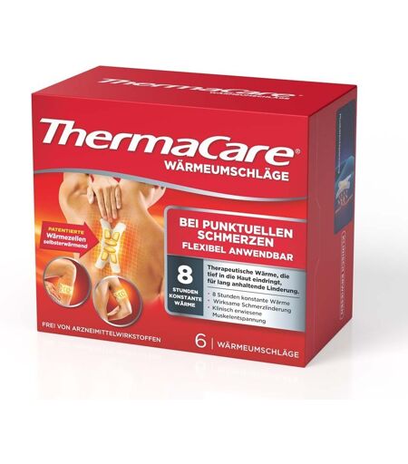 ThermaCare - enveloppements thermiques Application flexible Les douleurs ou tensions musculaires ponctuelles peuvent souvent être soulagées efficacement par la chaleur - les enveloppements thermiques ThermaCare pour tout le corps produisent une chaleur profonde apaisante pendant au moins 8 heures et soulagent la douleur là où elle se manifeste. En améliorant la circulation sanguine vers le muscle, la tension peut être soulagée plus rapidement. La température thérapeutique idéale d'environ 40 degrés est atteinte en une demi-heure, l'enveloppe thermique dégage alors constamment cette température - pour une vie sans douleur ! ThermaCare convient également aux mères qui allaitent. Idéal pour le traitement des douleurs localisées Soulagement efficace de la douleur et libération de la tension grâce à des coussins chauffants Le coussin chauffant souple pour la relaxation musculaire en déplacement Les coussins chauffants peuvent être fixés de manière flexible à la peau à l'aide de quatre points adhésifs Détails du produit ThermaCare - une application flexible pour les douleurs localisées Fournir une chaleur profonde pendant 8 heures sont discrets, ne glissent pas et peuvent également être portés sous les vêtements en voyage ou au bureau Ce qu'il est important de savoir Ne jamais chauffer l'enveloppe au micro-ondes, au four ou de toute autre manière - risque d'incendie ! Jusqu'à 55 ans, vous pouvez également porter ThermaCare la nuit Pour l'utilisation de ThermaCare pendant la grossesse, il faut d'abord consulter un médecin. Si vous êtes diabétique et que vous souhaitez utiliser ThermaCare, veuillez d'abord consulter votre médecin. Veuillez ne pas humidifier ni laver la couverture ou le coussinet, cela rend les cellules thermiques inefficaces - la transpiration corporelle normale n'affecte pas le fonctionnement de ThermaCare. Le principe ThermaCare Le développement de la chaleur ThermaCare est basé sur un principe naturel efficace - la chaleur par oxydation. Ainsi, les compresses et les recouvrements se réchauffent d'eux-mêmes lorsqu'ils entrent en contact avec l'air et sont exempts de toute substance médicamenteuse. Ainsi, ThermaCare met naturellement un signe contre les douleurs musculaires, menstruelles et articulaires et vous soutient dans une vie sans douleur ! Quantité nette : 6x coussins chauffants de ThermaCare pour une application flexible. ...